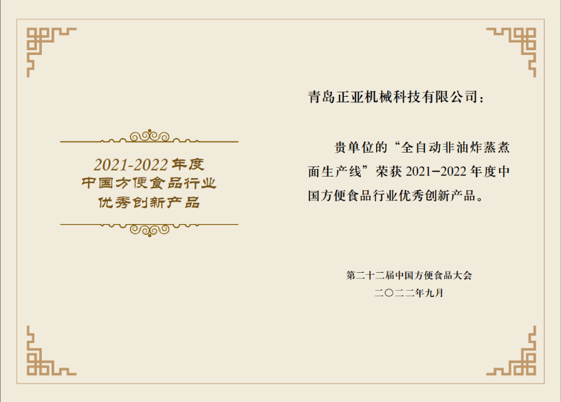 我司作為參會方,非常榮幸的在第二十二屆中國方便食品大會以“全自動非油炸蒸煮面生產(chǎn)線”榮獲2021-2022年度中國方便食品行業(yè)優(yōu)秀創(chuàng)新產(chǎn)品獎。